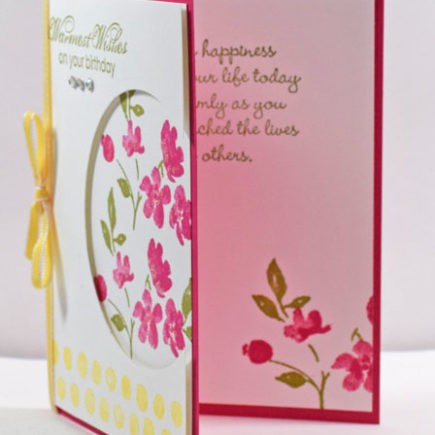 Today’s card is a birthday card that can easily be made into a Mother’s Card or any other occasion. I used the Painted Petals set in the Occasions Catalog to create it. This set has many different images that gives you many ways to create. Along with the Painted Petals, I used the Circles Collection Framelits to create my opening. I placed the circle …