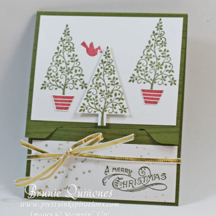 Here are 3 more gift card holders . . . I used the image from the Ornamental Pine stamp set for the first one and the faux diamond dust technique. How to Get a Beautiful Glittery Effect: Stamp your image Cover your entire cardstock with the stamped image with VersaMark ink Pour Heat & Stick Powder to cover entire cardstock; shake off excess Using heat tool …