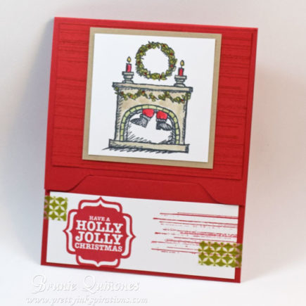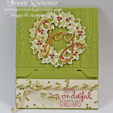 Here’s another gift card holder using the Wondrous Wreath Photopolymer stamp. I kept the colors the same as the one in yesterday’s post. I used the framelits that coordinate with the stamp to die cut “Joy” onto a Gold Foil Sheet. This is the inside – when you open it up, it slides up and reveals the gift card. It measures 6-1/2″ x 3-3/4″ and …