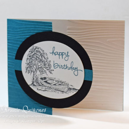 Moon Lake is a great stamp for masculine cards. For this birthday card, I cut the Island Indigo card base at 5-1/2″ x 8″, scored it at 2-3/4″ and embossed the front of it. I placed the 5-1/2″ x 4-1/4″ Whisper White cardstock inside right on top of card base and embossed half of it to leave room for the inside sentiment. I used …