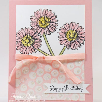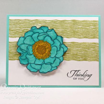 I love everything about this card – the Blended Bloom flower colored with the Coastal Cabana Blendabilities and the great backdrop created with one of the images from the Chalk Lines photopolymer stamp. After I colored the flower I cut around it and popped it with Stampin’ Dimensionals – love it. However, I don’t know about you, but although I like the look of images cut out …