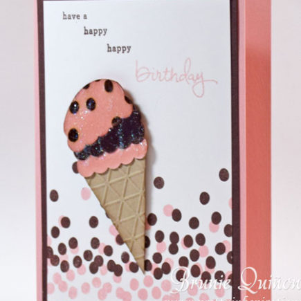 Today’s birthday card uses the Dotty Angles stamp. Doesn’t it make a great celebration card? I also used it on the ice cream portion – looks like chocolate chips, doesn’t it? The cone was embossed with the new Tiny Triangles Embossing Folder. Any kid would love receiving this card – my niece absolutely LOVED her ice cream cone card! Don’t forget to take advantage …