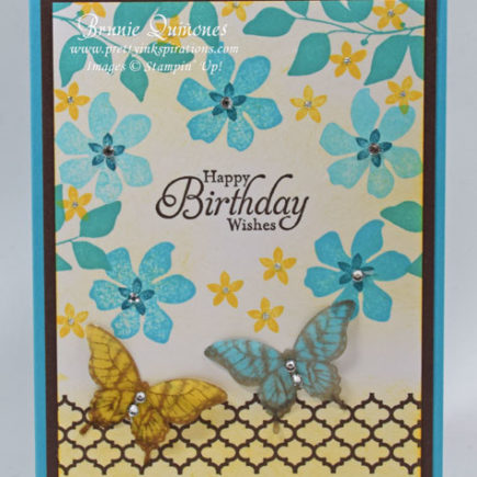 I’m ready for warm weather and these flowers from the Summer Silhouettes stamp remind me that it’s just around the corner – they make me happy. I stamped the butterfly on vellum, colored it on the back with markers and sponged the bottom of the card with Daffodil Delight ink. Here’s another card using the Papillon Potpourri and the Field Flowers stamp set that will …