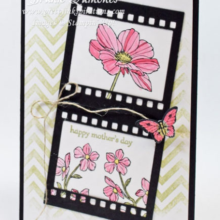 I love the On Film Framelits – they’re so much fun. You can use them to focus on an image or simply put a favorite picture of yours. I colored the flowers from the Peaceful Petals Stamp Set with my blender pens. The top flower is one of my favorites from this set found in the Occasions catalog (good through June 1). And what can I say …