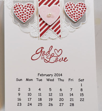 I had hoped to show you the card I’m giving my husband for Valentine’s Day but I still need to make it! That means, early morning I’ll be in my stamping room creating one or at least before the day is out! So instead I’ll show you a calendar I made for myself. I used the Hearts a Flutter Stamp set and framelits. I love the doily behind …